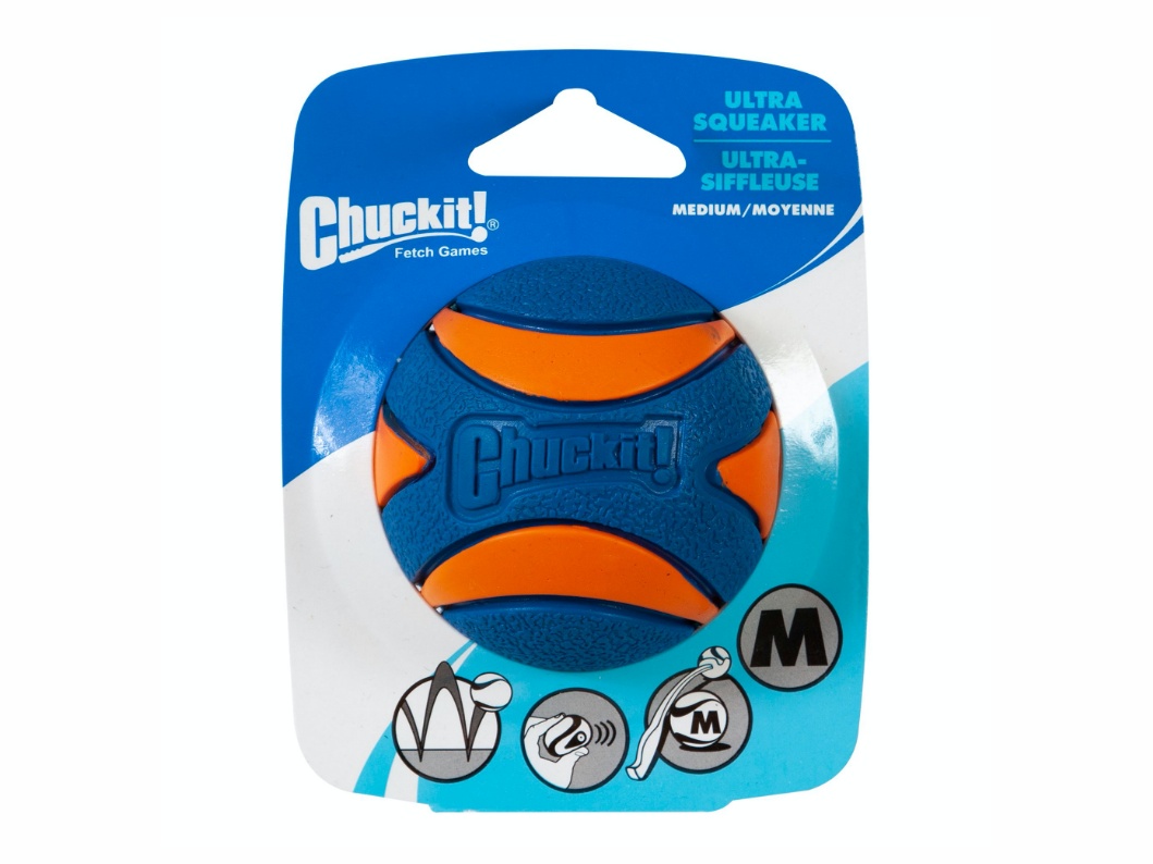 Chuckit Ultra Squeaker sípoló labda. A világító színének hála, könnyű megtalálni. Strukturált felülete és bordázottsága miatt a kutyák könnyedén meg tudja fogni. A klasszikus teniszlabdával ellentétben nem koptatja a fogakat. Igazán jól pattog és képes magasra pattani is. Kompatibilis a Chuckit! labdahajítókkal.