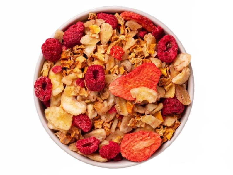 Összetétele: 100% szárított eper, málna, banán, sütőtök