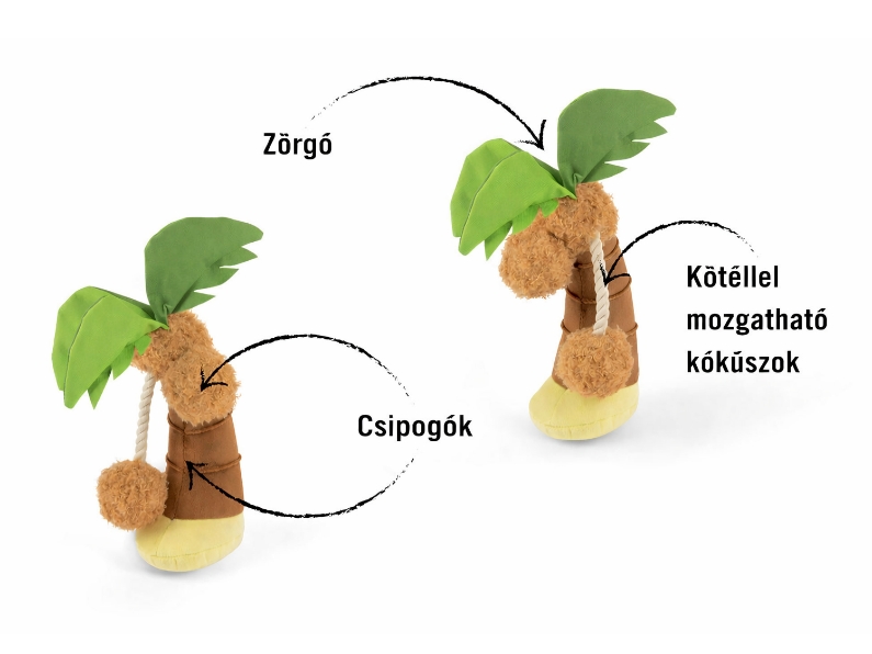 Kézzel készült, dupla külső rétegű vidám kutyajáték. A játékban csipogó és zörgő részek is találhatóak, így minden harapás izgalmas hangélményt ad. A kókuszok kötéllel mozgathatóak! A tartósság érdekében megerősített varrása és dupla külső rétege van. Környezetbarát PlanetFill töltettel készült. AZO-mentes festékekkel színezve! Mosógépben mosható és szárítógépben szárítható!