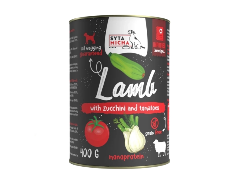 A Syta Micha bárány cukkinivel és paradicsommal egy gabonamentes nedves konzerv. Monoproteines, tehát egyféle fehérjéből készült. A bárány könnyen emészthető húsfajta. Érzékeny pocakú és allergiás kutyák számára is ideális. A cukkini és a paradicsom kiváló rost- és vitaminforrás. A hozzáadott lazacolaj és MSM jótékony hatással van az ízületekre, valamint támogatja a bőr és a szőrzet egészségét. Nem tartalmaz mesterséges adalékanyagokat! Gabonamentes.