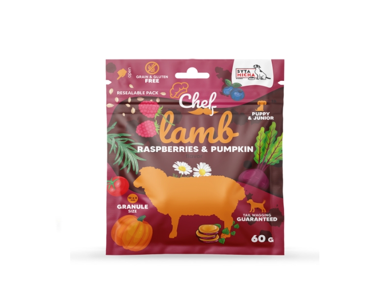 Összetevők: bárány 60% (friss bárányhús 30%, szárított bárányhús 30%), szárított édesburgonya 26%, sertészsír 10%, ásványi anyagok, cékla 1%, málna 0,5%, sütőtök 0,5%, tökmag 0,4%, áfonya 0,3%, édeskömény 0,2%, szárított sörélesztő 0,2%, kamilla 0,2%, körömvirág 0,1%, csalán 0,1%, lenmag 0,1%, rozmaring 0,1%, zöldtea-kivonat 0,05%, új-zélandi zöldkagyló-kivonat 0,05%, omega-3 0,001%, yucca schidigera kivonat 0,001%