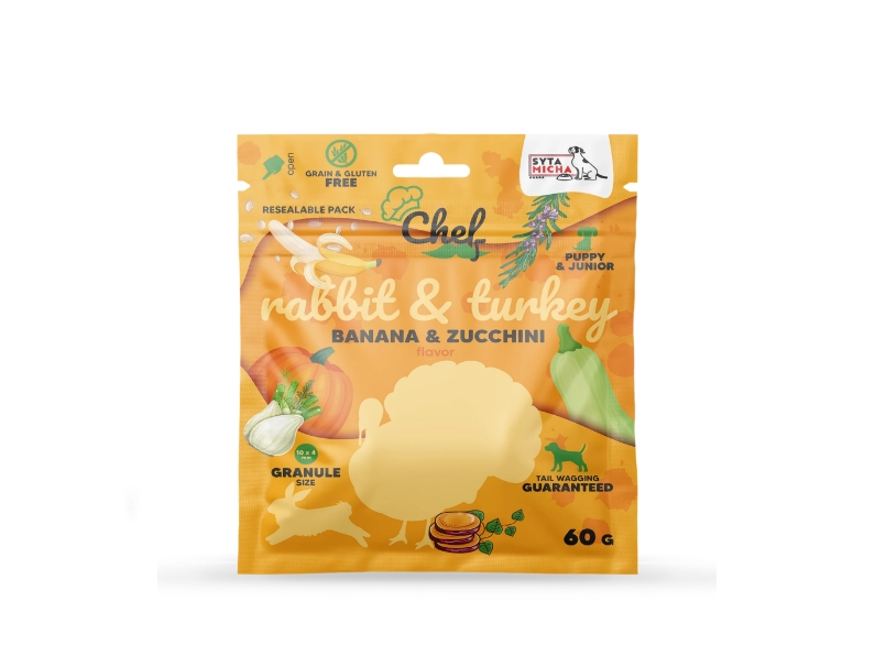 Összetevők: friss nyúlhús 30%, szárított pulyka 30%, szárított édesburgonya 25%, pulykazsír 10%, ásványi anyagok, banán 1%, sütőtök 0,5%, tökmag 0,5%, szárított sörélesztő 0,3%, cukkini 0,3%, édeskömény 0,2%, rozmaring 0,1%, körömvirág 0,1%, csalán 0,1%, lenmag 0,1%, zöldtea-kivonat 0,05%, új-zélandi zöldkagyló-kivonat 0,05%, omega-3 0,001%, yucca schidigera kivonat 0,001%
