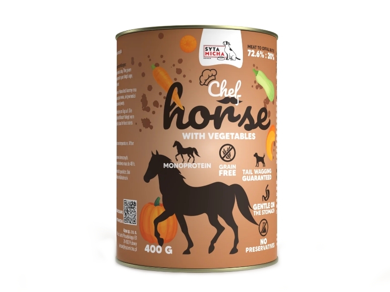A Syta Micha lóhús sütőtökkel és répával egy gabonamentes nedves konzerv. Monoproteines, tehát egyféle fehérjéből készült. Rendkívül magas 92,6% lóhús tartalommal. A lóhús a magas vas tartalmú húsfélék közé tartozik. Alacsony a kalória és a zsírtartalma! Könnyen emészthető. Emellett a sütőtök, a sárgarépa és a cukkini kiváló rost és vitamin forrás. A hozzáadott sörélesztő jótékony hatással van az emésztésre illetve a szőrre, bőrre. Hízékony kutyák számára is ideális! Nem tartalmaz mesterséges adalékanyagokat! Gabonamentes.
