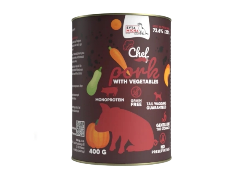 A Syta Micha sertés sütőtökkel és répával egy gabonamentes nedves konzerv. Monoproteines, tehát egyféle fehérjéből készült. Rendkívül magas 92,6% nyúlhússal tartalommal. Emellett a sütőtök, a sárgarépa és a cukkini kiváló rost és vitamin forrás. A hozzáadott sörélesztő jótékony hatással van az emésztésre illetve a szőrre, bőrre. Nem tartalmaz mesterséges adalékanyagokat! Gabonamentes.