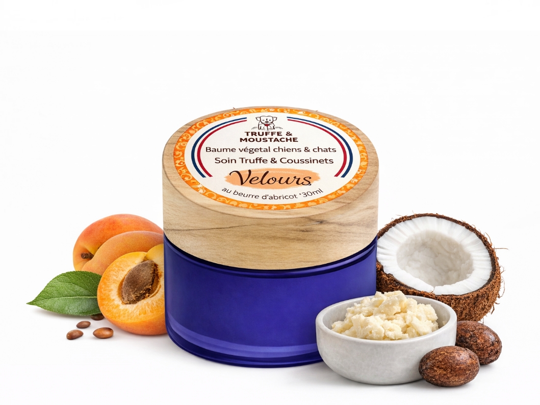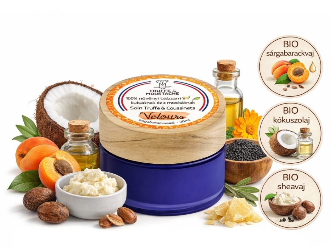 A Truffe & Moustache egy természtes orr és mancsápoló krém. Hidratálja és regenerálja a száraz, kirepedezett bőrfelületet. Természetes bio gazdálkodásból származó növényi összetevőkből készült. Biztonságosan lenyalható! A legfontosabb összetevői bio sheavaj, bio sárgabarackvaj, bio kókuszolaj, bio körömvirág kivonat és bio feketekömény olaj. A sheavaj, a mandulavaj és a sárgabarackvaj mélyen hidratálja és táplálja a bőrt. A körömvirág kivonat nyugtató és gyulladáscsökkentő hatású. A feketekömény olaj lipidekben gazdag illetve enyhíti az irritációt. Vegán. Vegyszermentes!